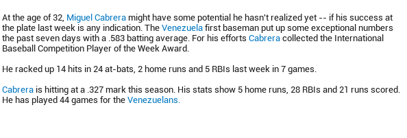 - Asdrubal Cabrera and Miguel Cabrera would both homer in Venezuela’s 6-2 win over Puerto Rico, but Jose Altuve was injured in a baserunning collision. A diagnosis was pending.