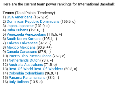 But, nevermind that, another set of series started on that Saturday: Netherlands at Australia, Venezuela at Japan, Puerto Rico at Taiwan, Korea at Dominican Republic, Italy at USA, Rest-Of-World at Cuba, Colombia at Mexico and Canada at Panama.