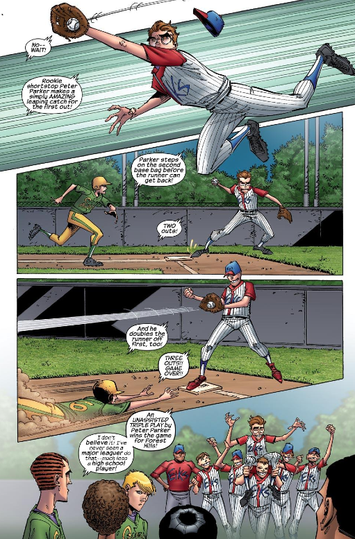 Anyway, it looks like Midtown is going to win when Harry Osborn hits a screeching line-drive, but then Peter makes an awesome catch pulls a triple-play, which the comic calls an unassisted triple-play, even though it is is clearly a 6-3 triple play: