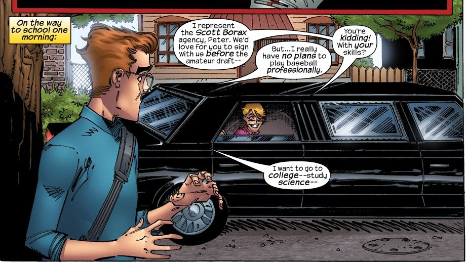 Meanwhile, the new fame of Peter Parker, Baseball Star has brought many pitfalls to him. Scott Borax (really, Scott Borax?) sends a woman to poach Pete and make him forget his studies and instead go for the glory and money of a big-league career: