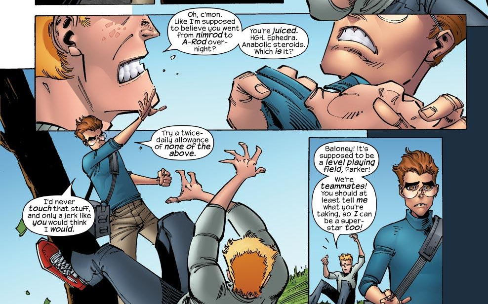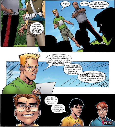 This again shows the dark side of sports. Peter Parker suddenly shows athletic potential, and almost immediately he is being accused of steroid use. Why can’t we have magic, anymore? Why must Flash Thompson ruin the illusion? Look, he even wants to know how to get steroids as well, showing the slippery slope such use encourages! Also, did Flash know what “ephedra” or “anabolic steroids” were, or did he have to look them up? I mean, I’m mildly surprised he didn’t ask Peter if he had any “be-better-at-sports drugs.”