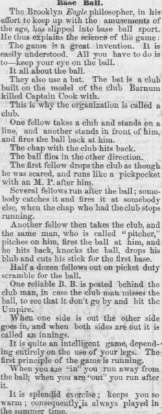 The first truly viral baseball story was an explanation of what baseball was… likely written by Henry Chadwick. It first appears in the Northeastern Viral Texts database as being printed in the Cleveland Daily Leader on October 18 in 1865, although it appears to be a at-best-paraphrased copy from a “Brooklyn Eagle Philosopher“. As I said earlier, it was almost certainly Henry Chadwick- baseball’s first sportswriter, statistician and overall salesman. He created the box score as we know it, as well as the statistics of batting averages and RBIs. The Eagle was his stomping grounds, so it seems natural he would be behind this. Here’s what this article said: