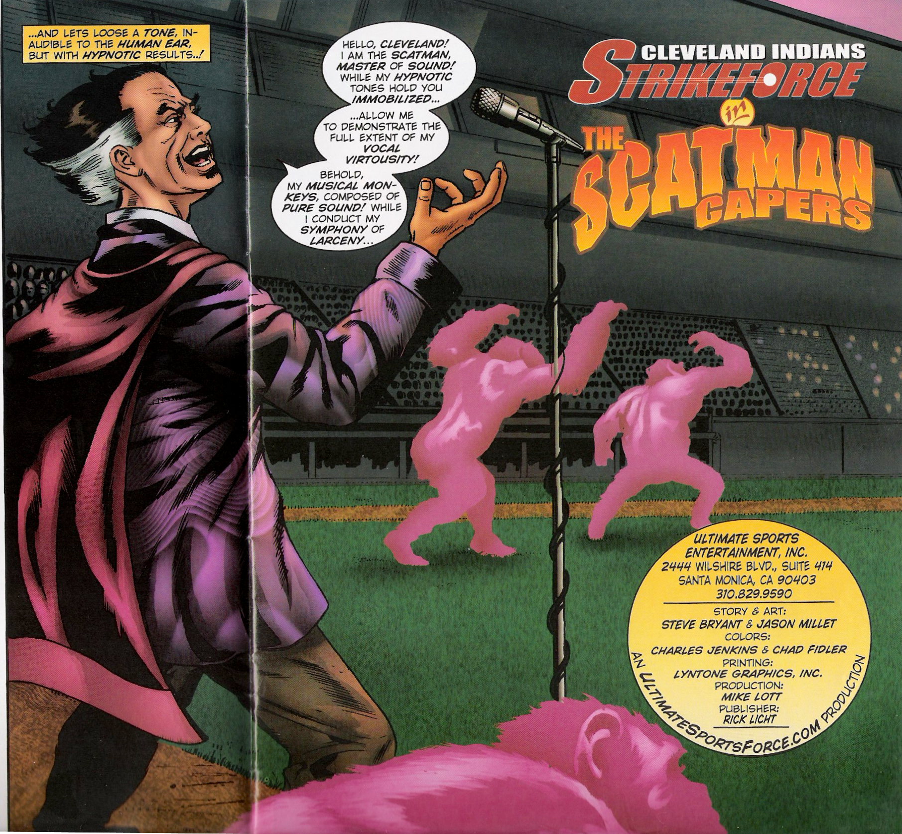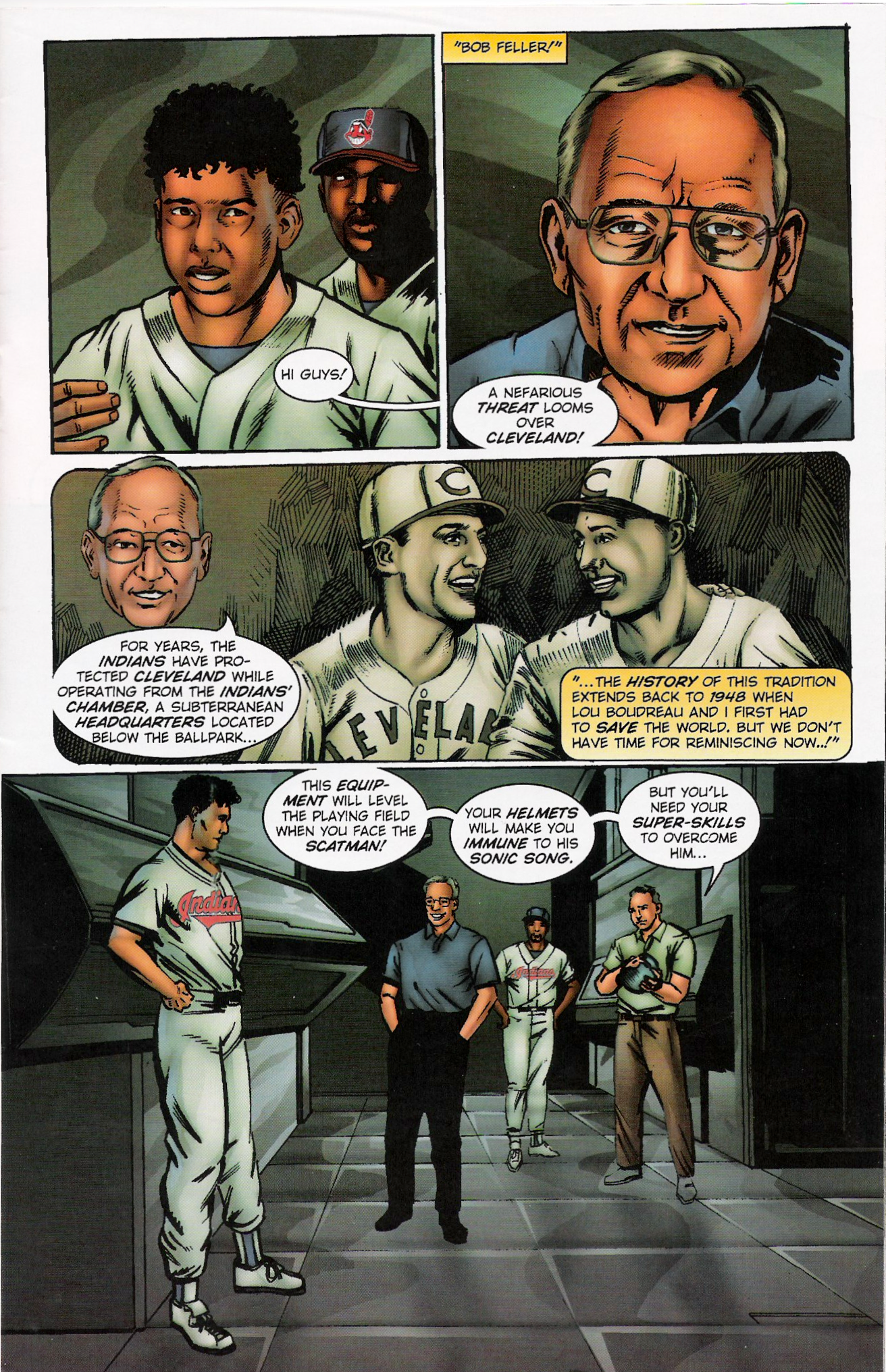Yes, this is a comic in which C.C. Sabathia, Bartolo Colon, Danys Baez, and Ryan Drese have to protect Cleveland from somebody called the Scatman. It also has Bob Feller, now-retired clubhouse manager Cy Buynak, and MONKEYS MADE OUT OF MUSIC. Go below the jump to see some of the glories it brings: