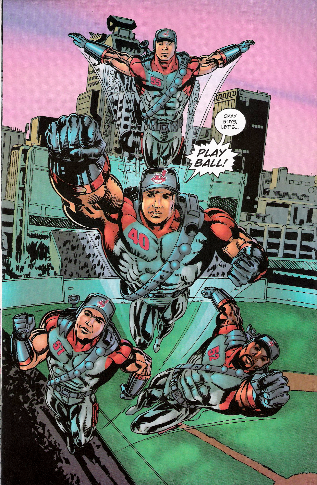 Already, this comic is off to a great start. And it’s just getting started, as clubhouse manager Cy Buynak (who retired in 2006) takes advantage of having been in the clubhouse safe from the hypnosis to run in after the Scatman leaves (ON THE BACK OF A FLYING MUSICAL MONKEY) to snap the 2002 Cleveland rotation out of it, bring them to a secret superhero base under Jacobs Field, and have them meet up with Bob Feller. Yes, Bob Feller, who apparently just sort of was waiting down there: