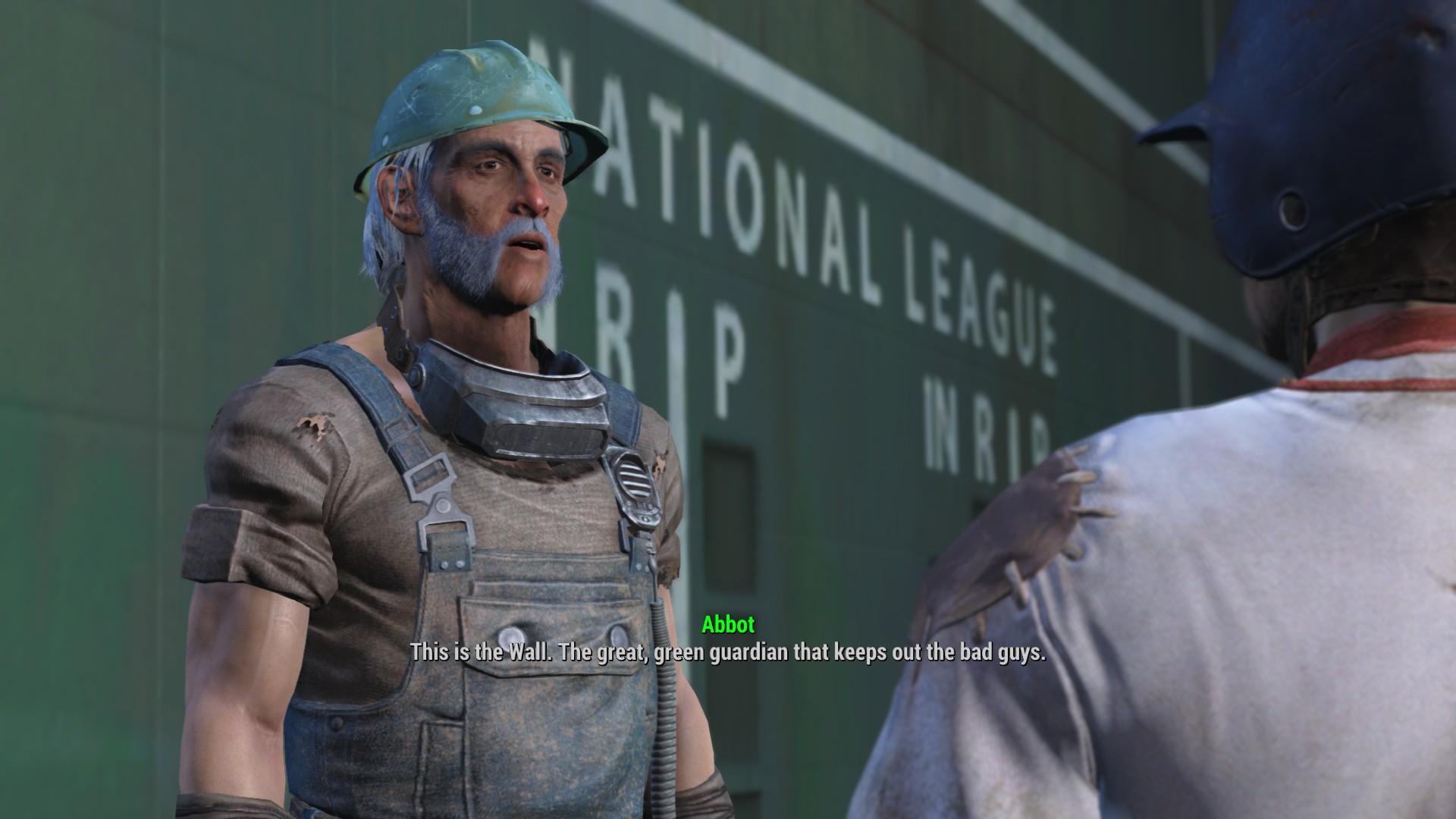 Yes, God Bless the Wall. Which, it should be noted, looks like it did before seats were added, fitting with the Fallout series’ eternal 1950s aesthetic. Well, it’s not a exact 1950s post-apocalyptic replica: for example, you can see the places in the scoreboard where the AL East standings would be, suggesting that in the Fallout universe divisions and so on were introduced.