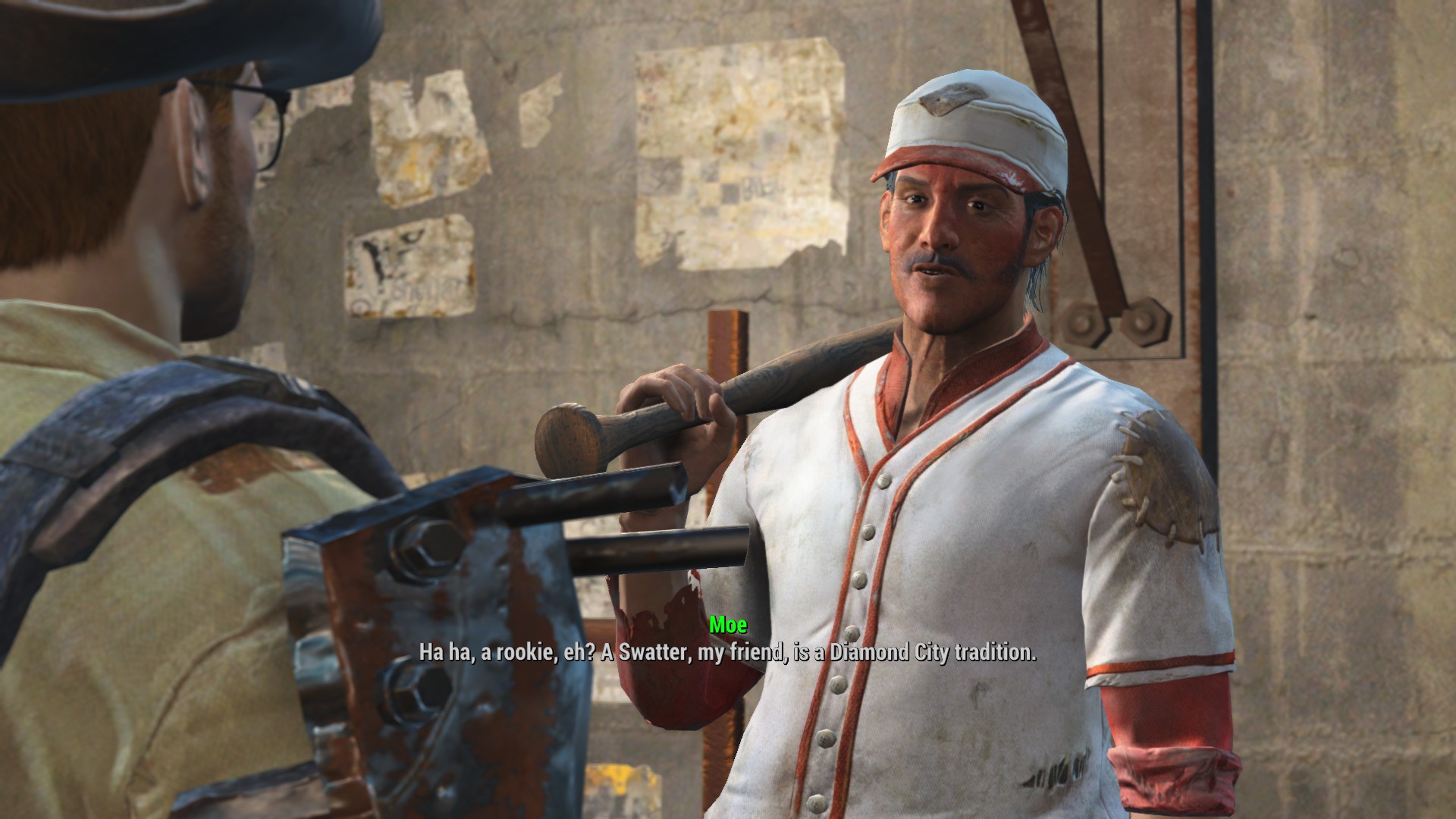 They aren’t the only ones in Diamond City wearing baseball gear, though. The local barber, for example, is clad in a old, stitched-up team jacket: