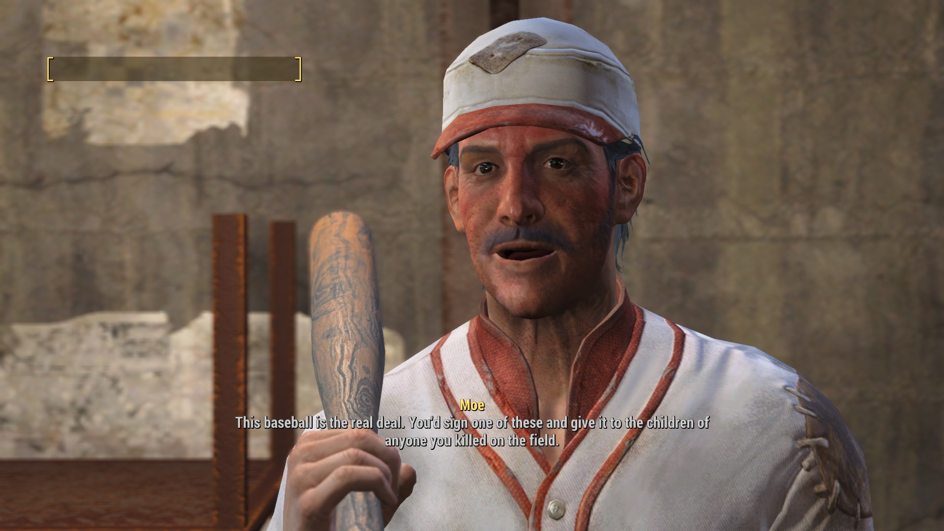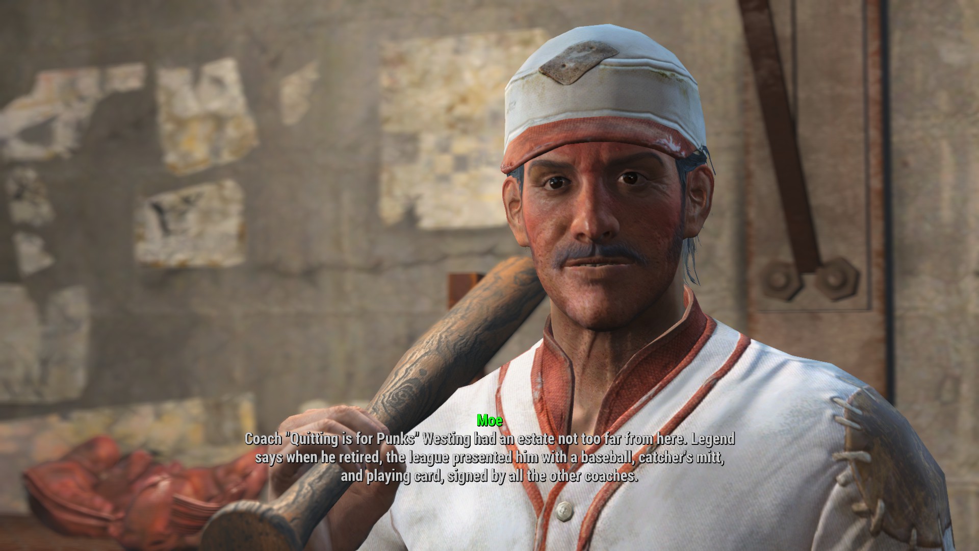 Yes, Moe Cronin here, more than any other character, is the big baseball presence of Diamond City, selling “Swatters” to people while dressed in an old jersey. And he intends to keep the baseball heritage of Fenway alive: