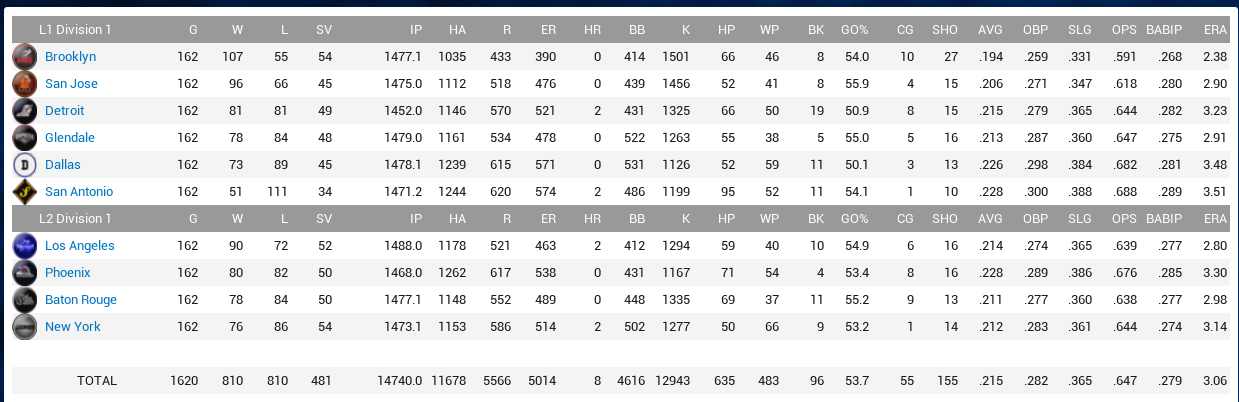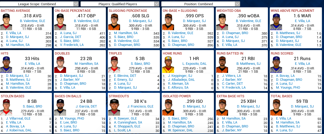 Oof. As you can see, the total number of Home Runs now stands at 3. The leading batting average is .312, and that’s the only BA over 300. The leader in doubles would already be tied for 30th all-time in a single season in the real world.