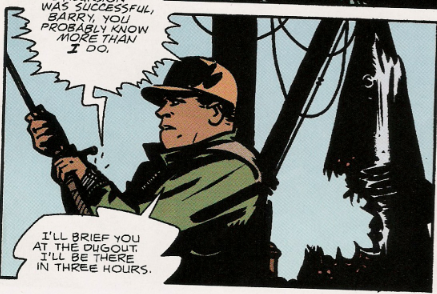 Meanwhile, the other senior member of the Squad, Barry Larkin, is undercover as a fisherman not far from Coast City. He was getting intel on what they are going to face. However, Cal (seen in full fighter-ace regalia) needs Larkin to pick somebody up before coming to the Dugout. A new recruit.