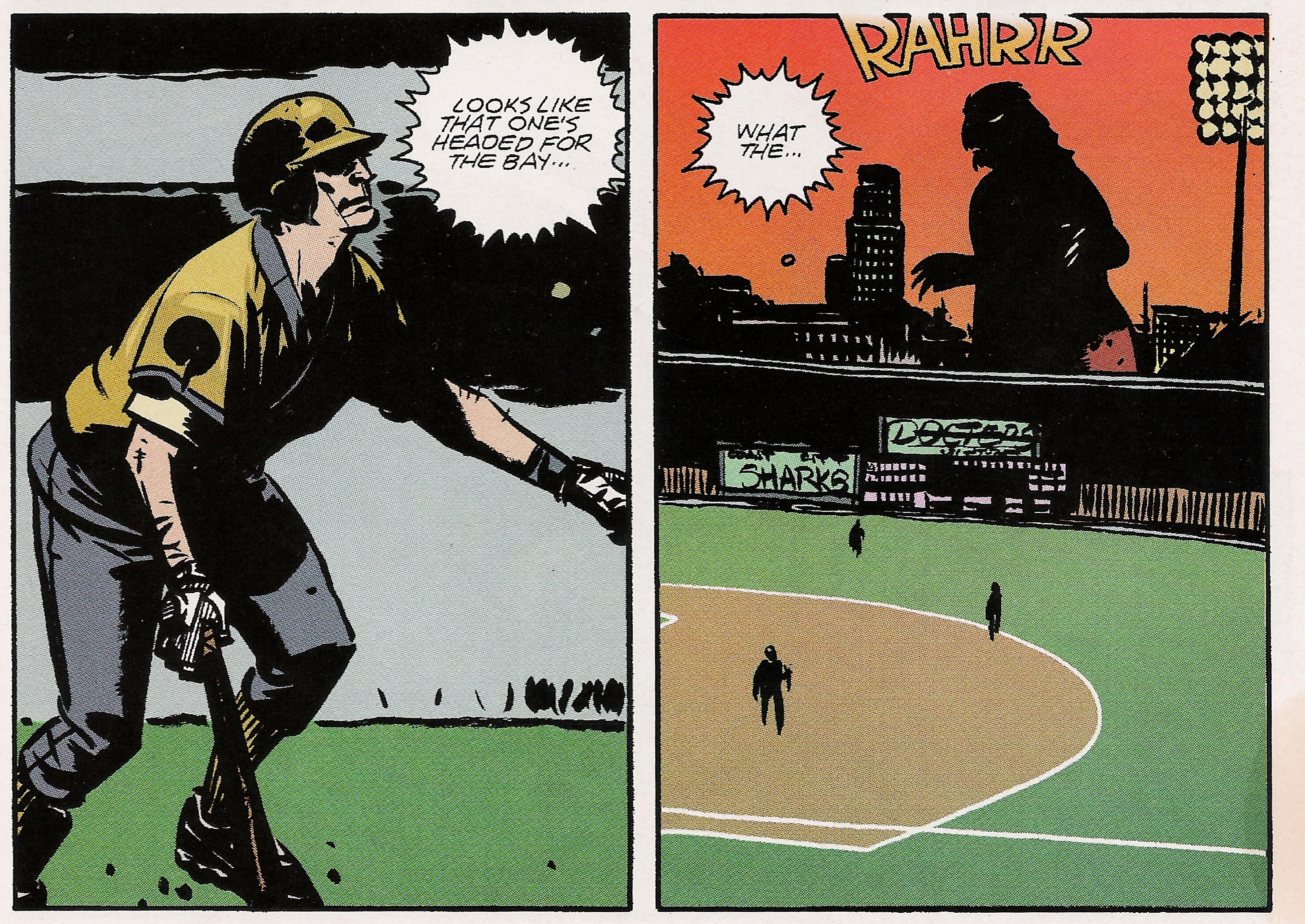 “What the…” indeed. I mean, wow, it’s not everyday that you are at the ballpark and suddenly a Kaiju* just shows up without warning right outside the stadium, using great stealth skills so it isn’t noticed until a ball is hit towards it.