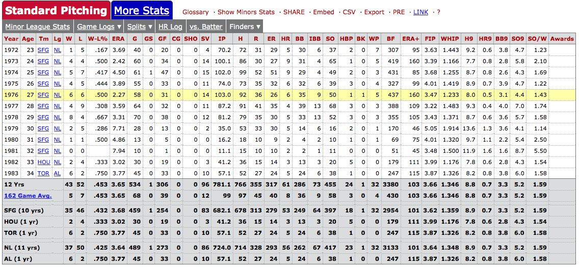 Randy Moffitt pitched in 534 MLB games and was among the NL saves leaders four times. Click the picture below to see his stats: