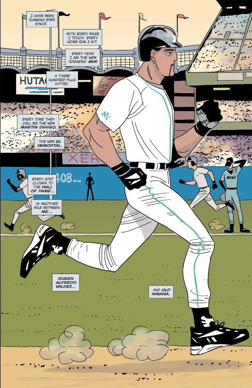 Anyway, first off, the first part of this two-part story is, obviously, Human Target #4. It is entitled “Part One: The Set-Up Man”. We begin with the life and death of New York star Ruben Valdez: leaving everything behind in Cuba, he has been figuratively and literally “running” ever since as he’s pursued a Hall-of-Fame career in the USA.
