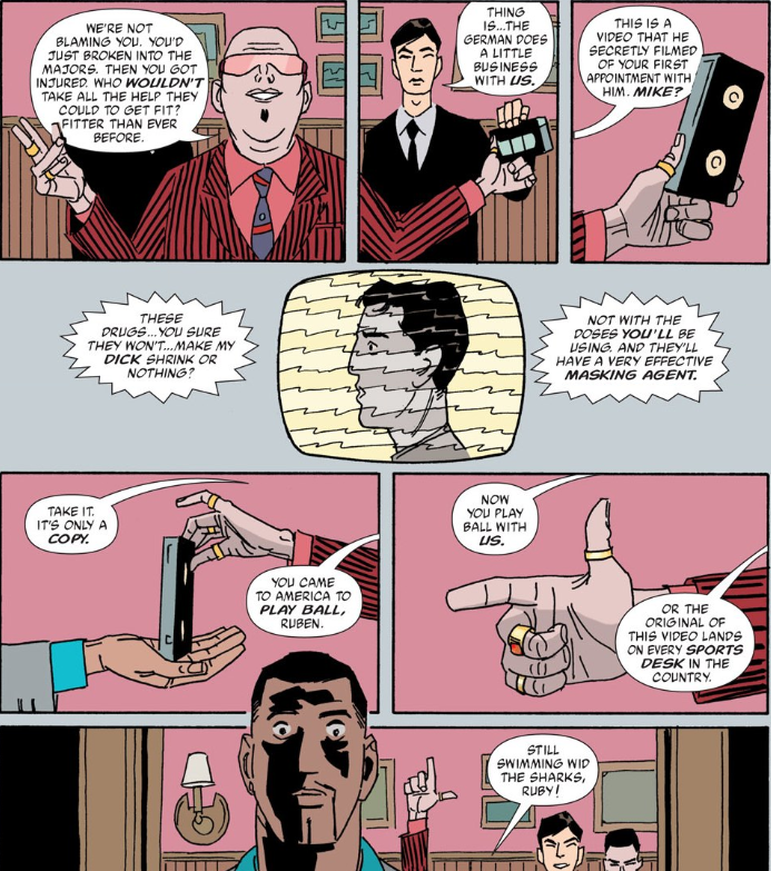 After this eruption of violence, it’s just a slow ending, as the wreckage of the events fall into place: Chance finds the blackmail library of steroid tapes but burns them, as he understands that he can never truly understand the pressure and desperation that the players face. He also finds some evidence to suggest that maybe Alisha McGee did have an affair with Ruben Valdez. And so, he tells the owner of the New Yorkers that he couldn’t figure anything out, and leaves New York for destinations unknown, ending the story…