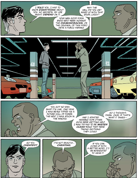 The fourth and fifth issues of the third volume of Human Target, entitled “Take Me Out To The Ball Game”, were published in late 2003 under DC’s Vertigo (mature audiences) label. Written by Peter Milligan and with art by Javier Pulido, it’s a dark tale involving gamblers, steroids, and murder. And yet, technically, by virtue of Christopher Chance’s earlier appearances in books with the DC superheroes, it technically is happening in the same universe as them. Weird, huh?
