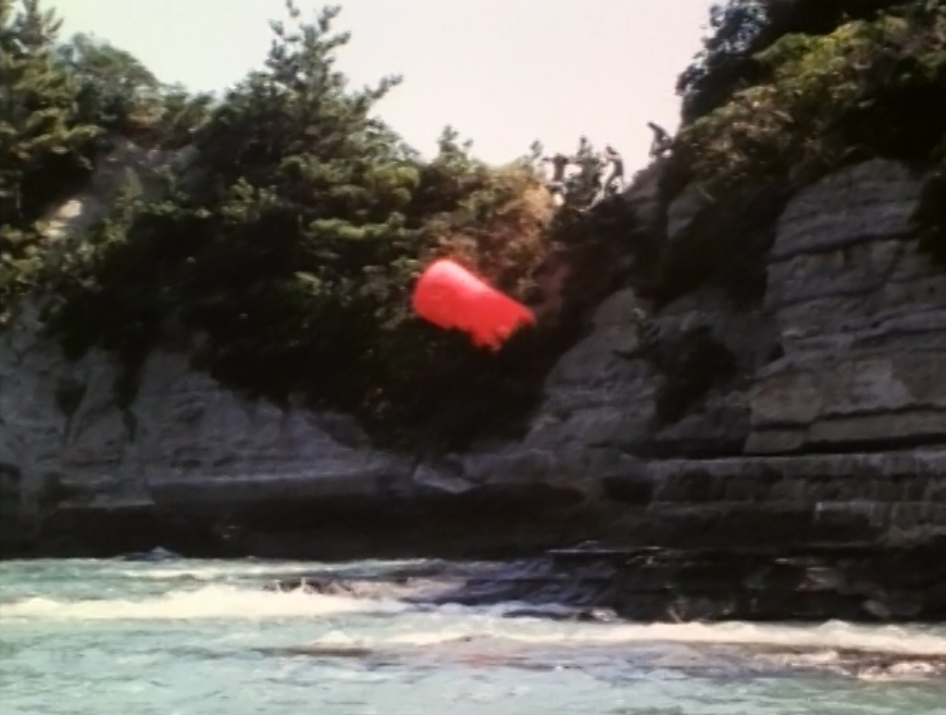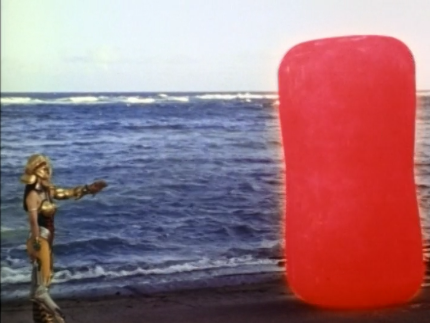 And so, the rest of the episode mostly just follows these two storylines, as Tommy tries out for the karate commercial, and Goldar has fellow henchman Scorpina attack the rest of the Power Rangers at the beach with the help of Putties and some sort of silkworm monster, eventually capturing them in a cocoon that looks like a odd-shaped jelly-bean on the outside…