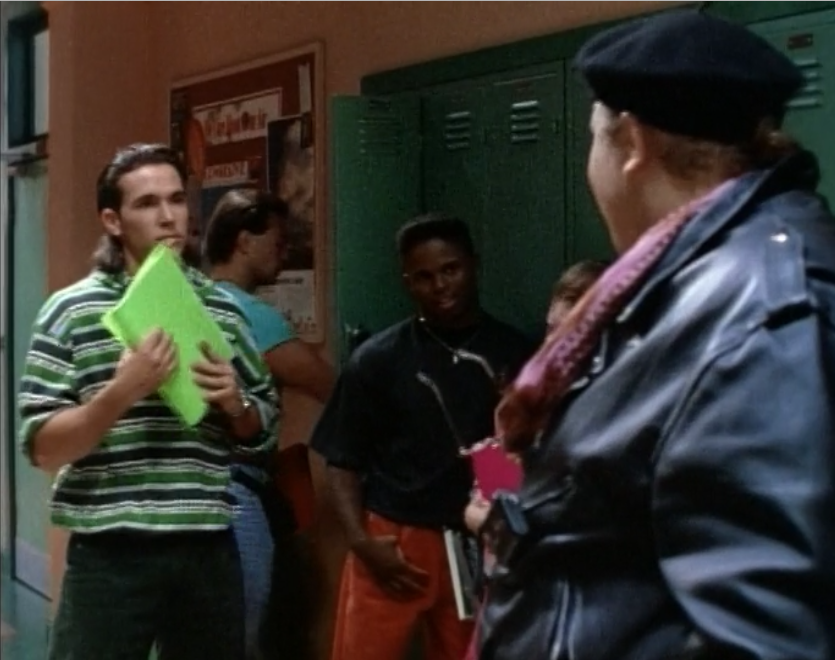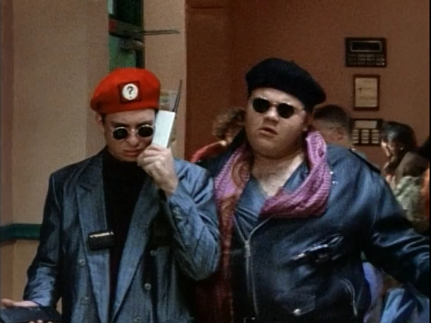 Oh, and his main competition is Farkas “Bulk” Bulkmeier, seen below with his best friend, Eugene “Skull” Skullovitch. Bulk is the big guy, Skull is the guy with the Riddler-beret and the incredibly 90s cell phone: