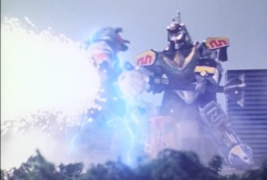 It also turns out that while everyone who had been hit by the little ball of love is now free, the giant Dora Pixie/Babe Ruthless instead has a love-gas that it sprays at people to turn them into mindless worshippers. Among those sprayed is, of course, the Pink Ranger. Without her around, the other Rangers (including the Green one, who comes out of exile) have no other choice but to enter what in North America is called “Dragonzord Battle Mode”, since Pink’s Guardian Beast/Zord is unavailable.