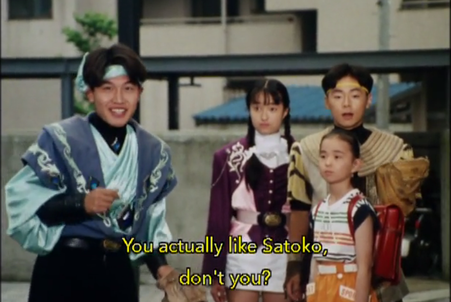 Oh, but wait! The little practice session is interrupted by a little girl named Satoko, who is being bullied by a kid named Jiro Yoshida, who the Blue Ranger is pretty sure is actually crushing on Satoko but doesn’t know how to express it: