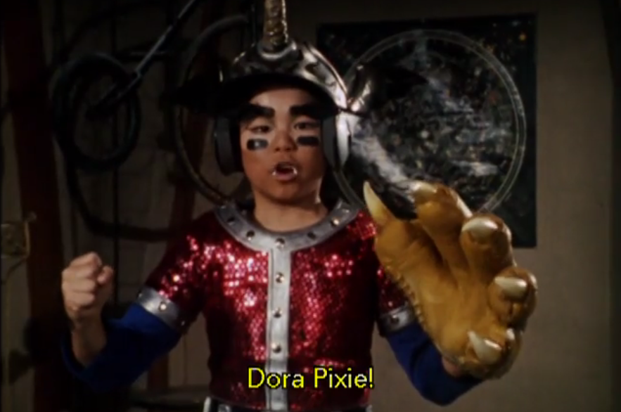 Meanwhile, with some help from the kids from earlier (who have been getting into their own stupid adventures), the Pink Ranger catches and breaks off Dora Pixie’s horn: