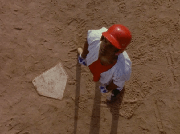 By coincidence, T.J. is up at that moment. Now, a quick Google search reveals that Selwyn Ward actually did play baseball in college, so when he comes to the plate, he actually doesn’t have that bad of a stance, if a little goofy because of the shorts, loose uniform, etc.: