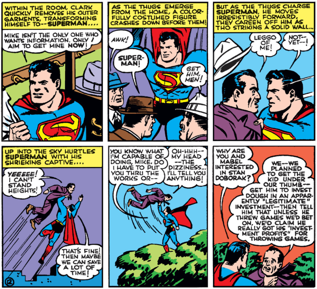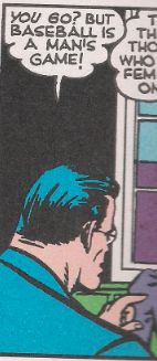But, wait! Lois wants to go, too! This despite the fact that Clark reminds us all that baseball is a man’s game, without any room for those ladyfolk and all their cooties. By the way, this is the first of a common theme throughout this issue: Golden-Age Superman is an asshole. This is act number one of douchery by Golden-Age Superman in this comic.