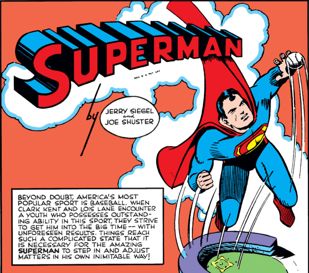 Our story begins, as these stories often do, with a splashy image of our hero doing something vaguely connected with the story. In this case, it’s Superman flying away from a ballpark, chasing after a baseball that only he could have hit: