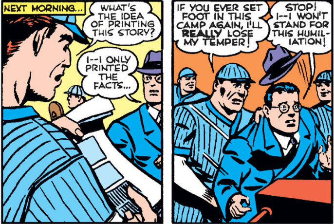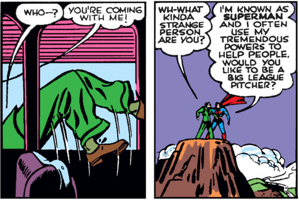 The most interesting thing his super-eyes can find is, of course, a baseball game. To be more specific, a game where there is a pitcher making the hitters look like fools. The opposing team doesn’t even want to play anymore! Yeah, this pitcher is good, so our intrepid reporters do what any good reporter would do: write up about the phenom who has escaped MLB notice. Oh, wait, that is what a good reporter would do, but this is the Golden Age, dammit. Ethics be damned, our heroes will convince the pitcher to come with them to become a professional ballplayer for Metropolis. Even after he says no:
