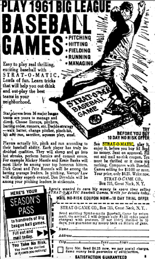 Strat-O-Matic began in 1961 and they put advertising in Sporting News right away, like in this August 23, 1961 ad.