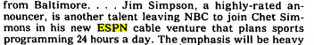 The first reference to ESPN came in a September 22, 1979 column by Dick Young, where he mentioned that Jim Simpson (who passed away recently) was joining the network: