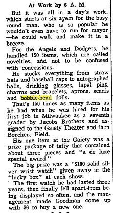 The first reference to bobbleheads comes in a profile of Danny Goodman on October 27, 1962. Goodman was one of the first big souvenir salesmen and was based on the west coast: