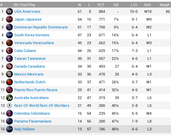 The first game of the Japan/DR series certainly lived up to the hype, with Japan winning 5-3, with Albert Pujols striking out to end the game to end a last-ditch DR rally. The Netherlands-Canada game also was quite evenly matched, with the Canadians winning 2-1 thanks to a 2-run rally in the 8th. That would allow them to tie Mexico for the 8th and final spot. Sure, it was still a long way until the playoffs, but every game counts. Elsewhere, Team USA somehow lost to Team Rest-Of-World 3-2, and Venezuela creamed Italy, 18-4.