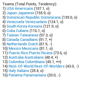Bad weather plagued much of the week, washing out three games in the Caribbean and South America on Monday alone, but in Nicaragua the weather was fine as South Korea won their 13th straight game. They’d win the next day two to make it 14, coming back late against Rest-Of-World to win 8-7 and then finishing off the sweep on Wednesday, 9-2, to make it 15 wins in a row.